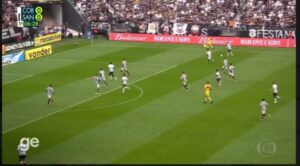 Na segunda imagem, já estão lá os 10 defensores. E nem assim eles impediram a tabela entre Roger Guedes e Jô, que só parou mais uma vez na última barreira de proteção, João Paulo.