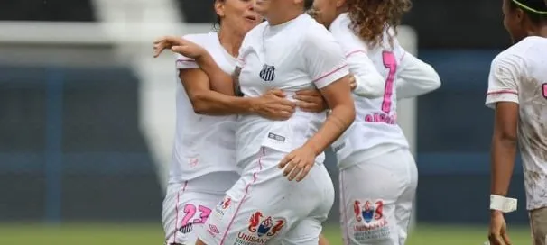 As jogadoras do Santos comemoram gol na vitória contra [...]