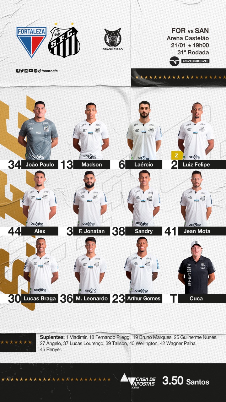 O Santos está escalado para a partida de logo mais contra o Ceará. Para o último confronto do ano, o técnico Cuca teve diversas baixas por problemas físicos e clínicos, mas decidiu não poupar nenhum jogador