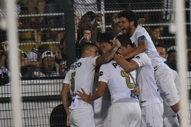 Jogadores do Santos comemoram um dos gols na vitória [...]