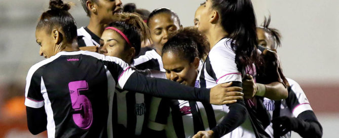 Jogadoras do Santos comemoram gol contra o Rio Preto [...]
