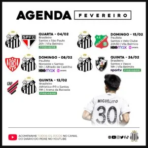 • 15/02 (dom): Santos x Velo Clube, às 20h30min, na Vila Belmiro – 8ª rodada do Paulistão (HBO Max e TNT)