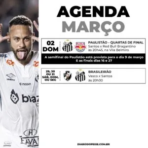 • 02/03 (dom): Santos x Red Bull Bragantino, às 20h45min, na Vila Belmiro – quartas de final do Paulista (Cazé TV e Paulistão +)
