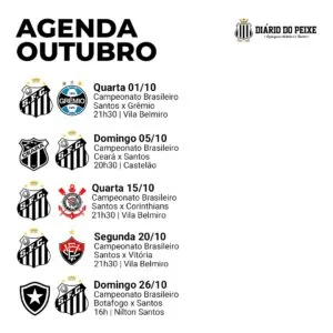 - 20/10 (seg): Santos x Vitória, às 21h30min, na Vila Belmiro – 29ª rodada do Brasileiro (SporTV e Premiere)
