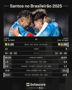 Os números referentes apenas no Brasileirão de 2025 são claros: com Neymar em campo foram 13 partidas (5 vitórias, 3 empates e 5 derrotas), totalizando 46,1% de aproveitamento; sem ele, em 9 duelos, o time soma 1 vitória, 2 empates e 6 derrotas, com 18,5% de aproveitamento.