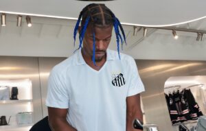 O norte-americano Jimmy Butler, astro mundial do basquete que atualmente joga pelo Miami Heat na NBA, voltou a publicar foto com a camisa do Santos. O atleta utilizou uma camisa branca de 2022, personalizada com o número 11 e escrito ‘Butler’, na inauguração da sua própria cafeteria, em Miami, nesta terça-feira (10).