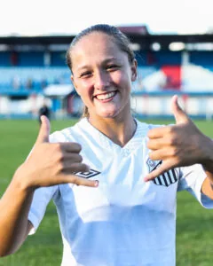 A lateral Barbara Cuzzuol comemorou a estreia no profissional feminino do Santos. A camisa 16 foi titular na vitória das Sereias da Vila sobre o Avaí/Kindermann por 2 a 0, no Carlos Alberto Costa Neves, pela primeira rodada do Brasileiro A-2, neste domingo (19). Após ‘estourar’ idade para a base, ela se destacou nos treinos no primeiro ano com o time principal.
