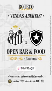 O Boteco Santista tem ingressos a venda para a partida entre Santos e Botafogo neste domingo (01), às 16 horas, na Vila Belmiro, pela 11ª rodada do Brasileirão. O valor para o Sócio Rei é de R$ 400,00 e o público geral paga R$ 300,00. Para adquirir os tickets, CLIQUE AQUI.