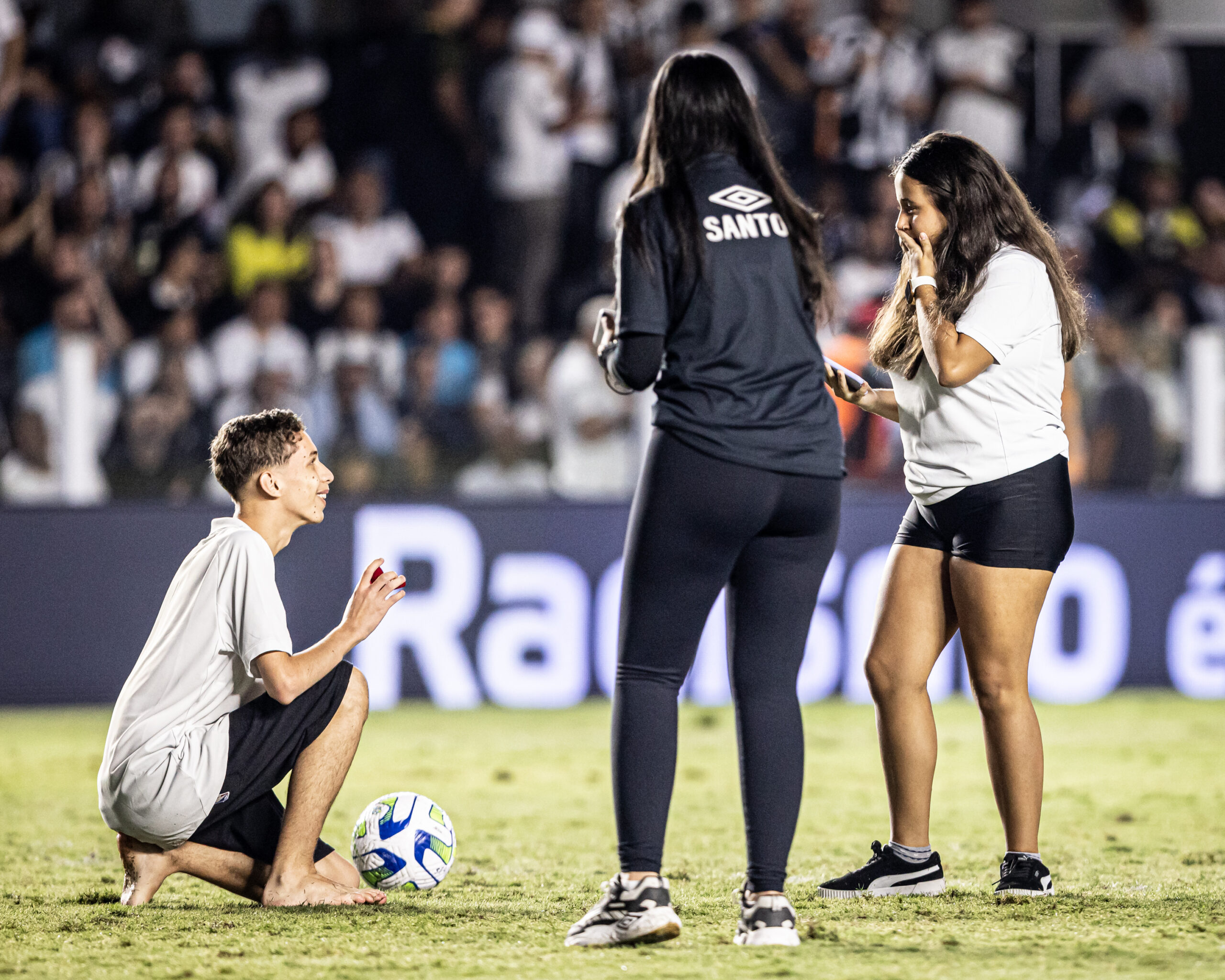 Vinicius fez o pedido para Mariana no intervalo da partida contra o Palmeiras (Crédito: Raul Baretta/Santos FC)