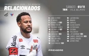 O Santos anunciou na noite desta sexta-feira a lista de jogadores disponíveis para o jogo contra o Fortaleza, duelo que será realizado sábado (1º), às 16h, na Vila Belmiro, pela 31ª rodada do Campeonato Brasileiro. A principal novidade é o retorno de JP Chermont, que volta a ser relacionado após período de reintegração no Sub-20; além da presença de Neymar, novamente à disposição da comissão técnica; e Zé Rafael, que volta de suspensão.