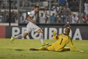 Sasha perdeu grande chance de marcar no primeiro minuto de jogo, quando chutou a bola no goleiro Júlio César (Crédito: Ivan Storti/Santos FC)