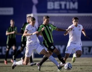 O Santos venceu o América-MG por 1 a 0, na Arena Vera Cruz, em Betim, pela 16ª rodada do Campeonato Brasileiro Sub-20, nesta terça-feira (01). O gol foi marcado por Luca Meirelles. A partida teve três expulsões, sendo duas da equipe da casa e uma do Peixe.