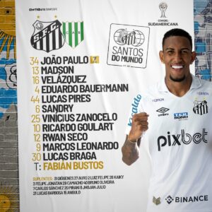 O Santos vai a campo com: João Paulo, Madson, Velázquez, Eduardo Bauermann e Lucas Pires; Sandry, Vinícius Zanocelo e Ricardo Goulart; Rwan Seco; Lucas Braga e Marcos Leonardo.
