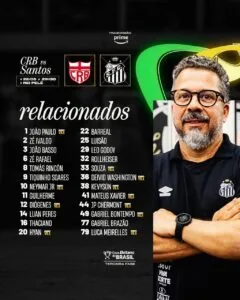 O Santos divulgou a lista de jogadores relacionados para enfrentar o CRB nesta quinta-feira (22), às 21h30, no Estádio Rei Pelé, em Maceió, partida de volta da terceira fase da Copa do Brasil. No jogo de ida, na Vila Belmiro, houve empate por 1 a 1. Quem vencer avança às oitavas; novo empate leva a disputa para os pênaltis.