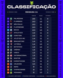 Confira a classificação após a 11ª rodada do Brasileirão 2026 (Crédito: @brasileirao)