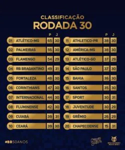 Tivemos seis vitórias de mandantes, duas de visitante e um empate. O Santos caiu duas colocações em relação a rodada 29 e terminou na 16ª colocação, somando 35 pontos, com oito vitórias, onze empates e onze derrotas, com 26 gols marcados e 36 sofridos.