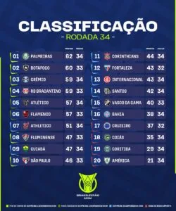 O Santos terminou a 34ª rodada do Campeonato Brasileiro de 2023 na 14ª colocação depois do empate com o São Paulo por 0 a 0, na Vila Belmiro, neste domingo (12). A equipe de Marcelo Fernandes soma 42 pontos com 11 vitórias, 9 empates e 14 derrotas com 37 gols marcados e 55 sofridos.