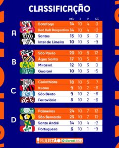 A décima rodada da fase de grupos do Campeonato Paulista 2023 terminou com 6 vitória de mandantes e 2 de visitante, com 19 gols marcados. O Santos ficou na terceira colocação do Grupo A, com 13 pontos, após a goleada sobre a Portuguesa por 4 a 0 na Vila Belmiro.