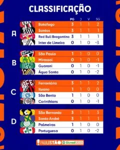 No mesmo grupo, o Botafogo-SP venceu a Portuguesa por 2 a 0 e assumiu a liderança pelo saldo de gols que é um dos critérios de desempate. O Red Bull Bragantino também somou 3 pontos depois de vencer o Corinthians por 1 a 0 em casa.