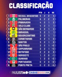 Classificação após a segunda rodada do Paulistão 2026 (Crédito: @paulistao)
