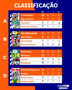 Entre os quatro grandes de São Paulo, o Palmeiras e Corinthians são os melhores colocado na liderança de seus grupos enquanto o São Paulo está em terceiro no Grupo B.
