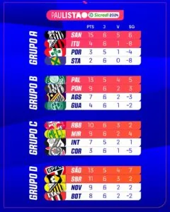 Com a vitória por 1 a 0 sobre o Corinthians nesta quarta-feira, o Santos manteve a liderança do Grupo A e a melhor campanha geral do Campeonato Paulista de 2024. O Peixe tem 15 pontos ganhos.
