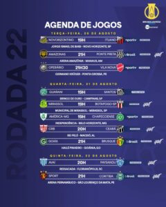 São outros jogos nesta terça-feira (20) entre Amazonas x Ponte Preta e Operário x Vila Nova. Outras cinco partidas na quarta-feira (21) entre Guarani x Santos, Mirassol x Botafogo, América x Chapecoense, CRB x Ceará e Goiás x Brusque. Na quinta-feira (22), Avaí x Paysandu e Sport x Coritiba fecham a rodada.
