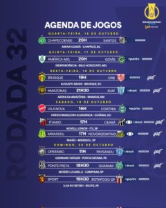 Nesta quinta-feira (17), Goiás e América-MG se enfrentam. Já na sexta-feira (18), duelam Brusque x CRB e Amazonas x Avaí. Já no sábado (19), jogos entre Vila Nova x Coritiba, Ituano x Ceará e Mirassol x Novorizontino. Por fim, a rodada fecha no domingo (20) com Operário-PR x Paysandu, Ponte Preta x Guarani e Sport x Botafogo-SP.