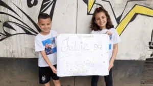 A relação de Jorge Sampaoli com as crianças Isabella e Bruno teve mais um bonito capítulo na manhã desta terça-feira. Os irmãos, de nove e sete anos, respectivamente, estiveram presentes no CT Rei Pelé e entregaram um cartaz de “Feliz dia dos Professores” ao treinador. Na mensagem, eles ainda escreveram. “Te amamos.