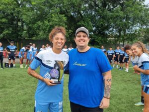 O repórter Guilherme Lesnok entrega o troféu de Craque da Galera para a atacante Cristiane