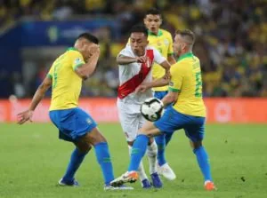 O meia Cueva tenta escapar da marcação da Seleção Brasileira na final da Copa América (Crédito: Federação Peruana)