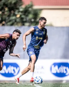 Na última parte do treinamento, o grupo foi dividido em dois setores do campo para trabalhos individuais e em duplas. Os atletas tinham o objetivo de superar o marcador e finalizar ao gol, com a participação dos goleiros.