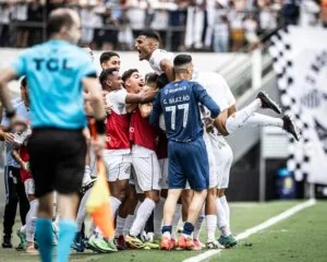 Jogadores do Santos comemoram o primeiro gol da equipe diante do Brusque (Crédito: Raul Baretta/SantosFC)
