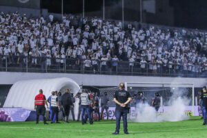 Aos 41 minutos do segundo tempo do clássico, torcedores arremessaram rojões no gramado e um cenário de guerra na Vila iniciou. Protestos direcionados também à diretoria pelo desempenho da equipe que não vence há nove jogos.