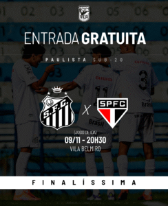 A decisão entre Santos e São Paulo neste domingo (09), às 20h30min, na Vila Belmiro, pela ida da final do Paulista Sub-20, terá entrada gratuita e torcida única santista. Os portões 1, 2, 7,8, 13 e 14 serão abertos às 19h30min. Menores de 18 anos só poderão ingressar no estádio acompanhados de pais ou responsáveis.
