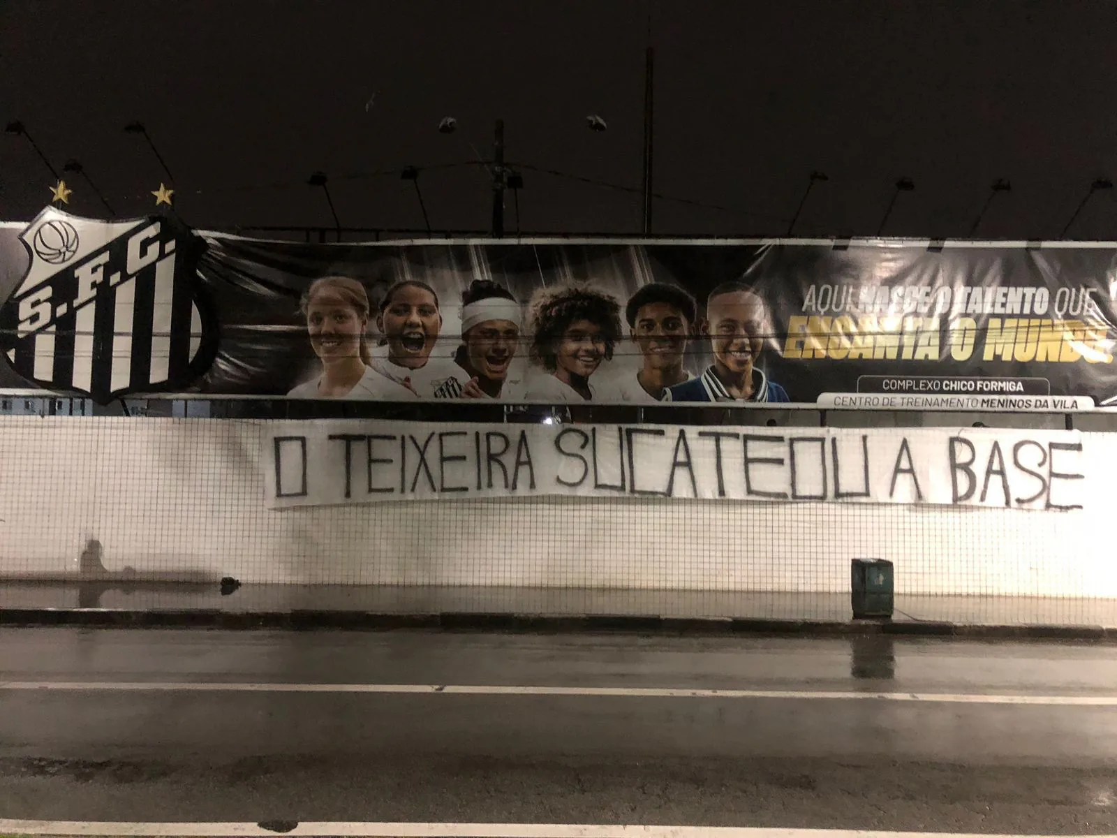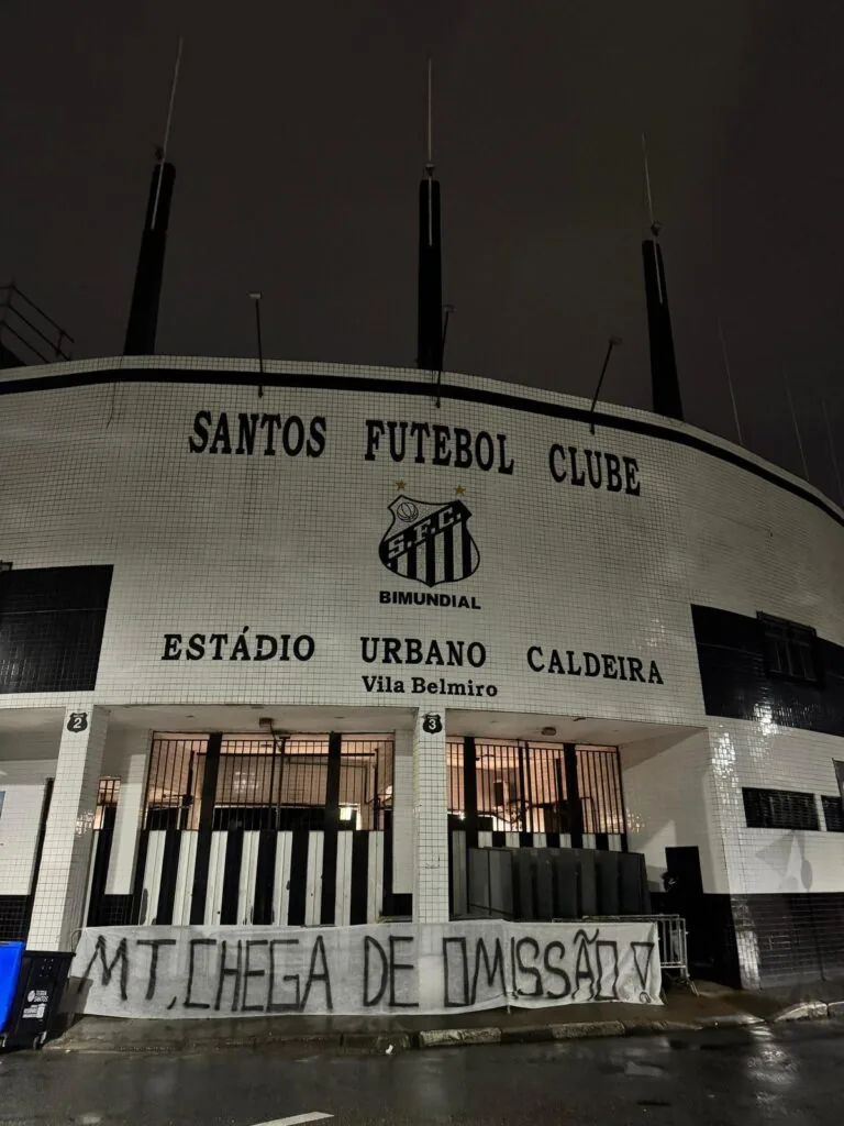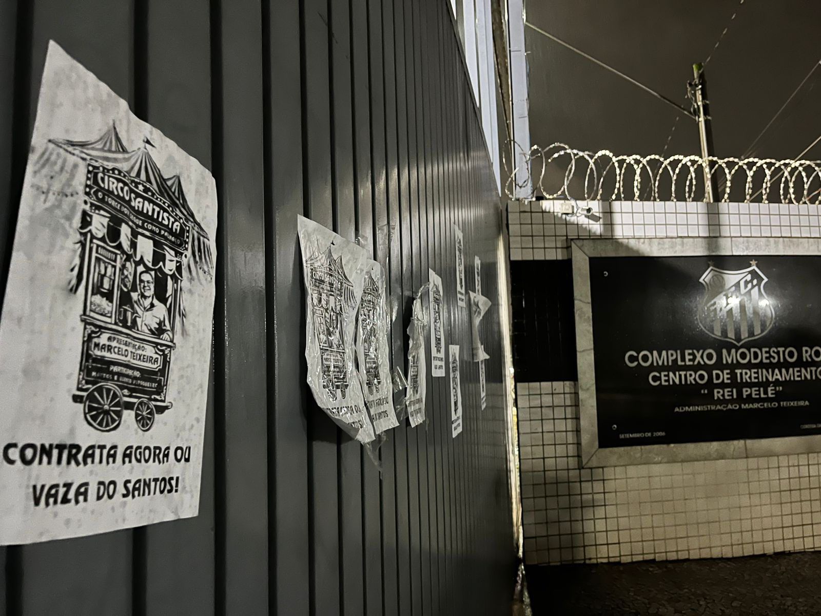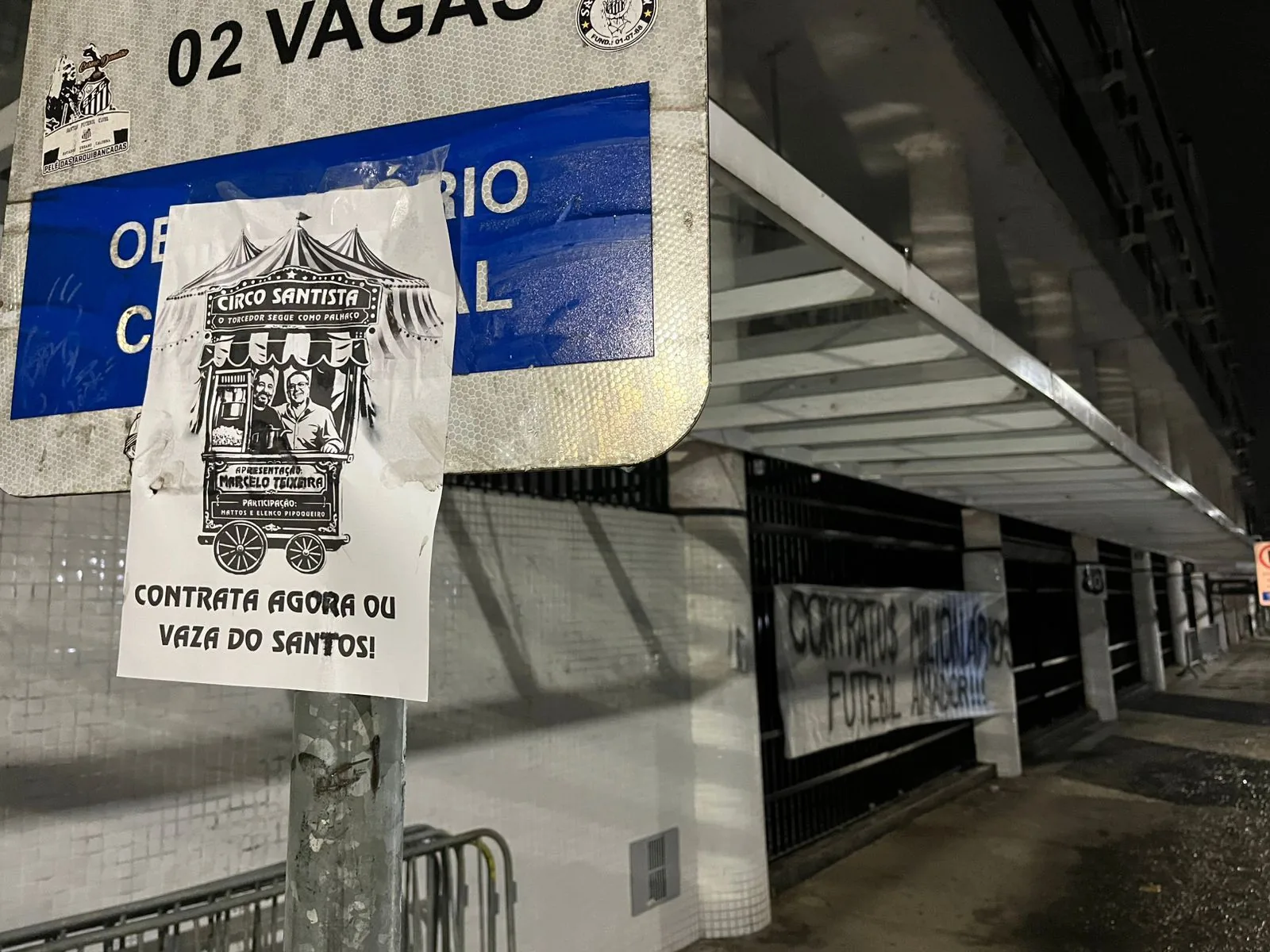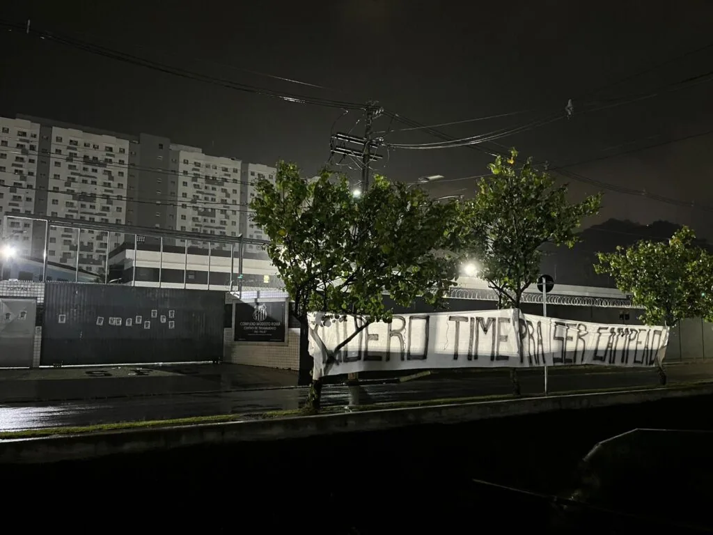 Revoltados com a situação do Santos, torcedores do clube espalharam diversas faixas e cartazes pela cidade entre a noite desta quarta-feira e madrugada de quinta. As mensagens tinham como principal alvo o presidente do clube, Marcelo Teixeira. Veja nas imagens algumas faixas, que foram removidas horas após a colocação.