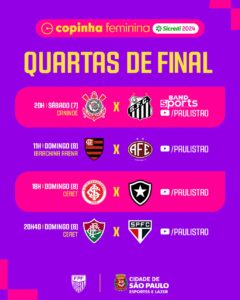 A FPF (Federação Paulista de Futebol) detalhou as quartas de final da Copa São Paulo Feminina. As Sereinhas da Vila enfrentam o Corinthians neste sábado (07), às 20 horas, no Canindé, em jogo único, com transmissão na Bandsports e Paulistão (YouTube). Os outros duelos acontecem entre Ferroviária e Flamengo, Internacional e Botafogo e Fluminense e São Paulo.