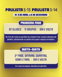 A FPF (Federação Paulista de Futebol) anunciou mudanças na disputa do Paulista Sub-13 e Sub-14 após Conselho Técnico realizado na sexta-feira (27). Serão 87 participantes, com data de início prevista para 5 de abril e término para 6 de dezembro. A ideia é respeitar o recesso das férias escolares em julho, dos dias 10 a 25, e terá três tempos, assim como foi divulgado para o Paulista Sub-11 e Sub-12.