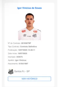 O lateral-direito Igor Vinicius foi regularizado no BID (Boletim Informativo da CBF) como novo jogador do Santos nesta quinta-feira (10). O jogador poderá estrear oficialmente pelo Peixe diante do Flamengo na próxima quarta-feira (16), às 20 horas, na Vila Belmiro, pela 14ª rodada do Brasileirão.