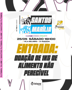 O Santos divulgou que não irá cobrar por ingressos, mas terá ação solidária para entrada no jogo das Sereias e Marília pelo Paulistão Feminino. A equipe do técnico Glaucio Carvalho duela às 16 horas, na Vila Belmiro, pela segunda rodada do estadual. Para o acesso, basta a doação de 1 kg de alimento não perecível.