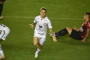 Aos 29, o Santos quase ampliou. Kaio Jorge recebeu na entrada da área e soltou a bomba cruzado, mas a bola saiu à direito do gol do Athletico-PR.