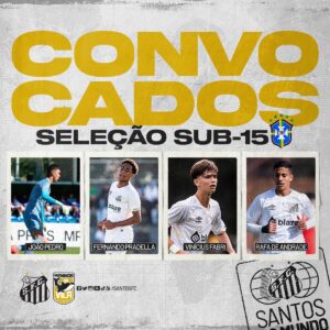 O Santos teve quatro Meninos da Vila convocados para a Seleção Brasileira sub-15. João Pedro, Fernando Pradella, Vinícius Fabri e Rafa de Andrade foram chamados para representar a Seleção em amistosos contra o Uruguai entre os dias 14 e 25 de agosto.