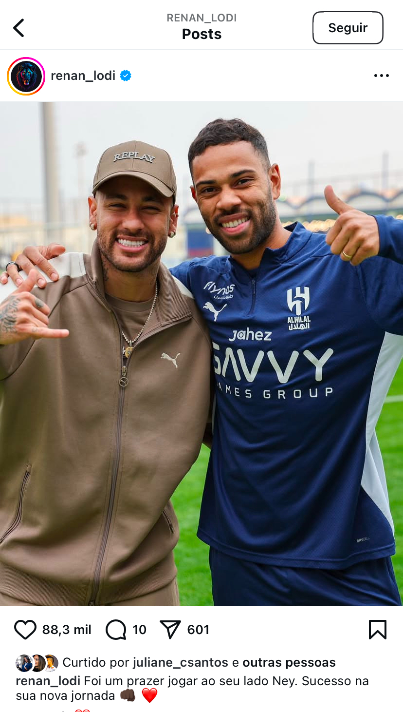 Antes de vir para o Brasil, o meia-atacante Neymar Jr se despediu do elenco e da comissão técnica do Al-Hilal (Arábia Saudita). A equipe saudita confirmou a rescisão do jogador na noite nesta segunda-feira (27). O lateral-esquerdo Renan Lodi e os atacantes Malcom e Marcos Leonardo fizeram posts no Instagram. (Veja abaixo)