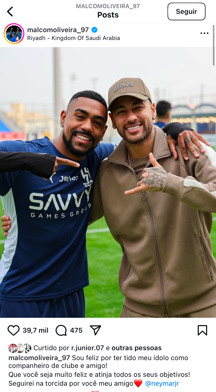 Antes de vir para o Brasil, o meia-atacante Neymar Jr se despediu do elenco e da comissão técnica do Al-Hilal (Arábia Saudita). A equipe saudita confirmou a rescisão do jogador na noite nesta segunda-feira (27). O lateral-esquerdo Renan Lodi e os atacantes Malcom e Marcos Leonardo fizeram posts no Instagram. (Veja abaixo)