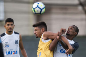 Luiz Felipe disputa jogada com Yuri Alberto, única centroavante de origem do elenco (Crédito: Ivan Storti/Santos FC)