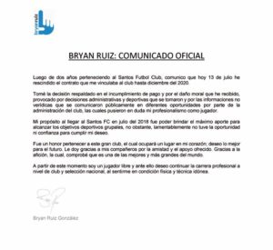 O meia Bryan Ruiz não é mais jogador do Santos. O anúncio foi feito pelo próprio atleta, através de suas redes sociais. A decisão foi tomada de forma unilateral pelo atleta, o clube foi notificado e tomará as medidas cabíveis. O costarriquenho tinha vínculo até dezembro de 2020.