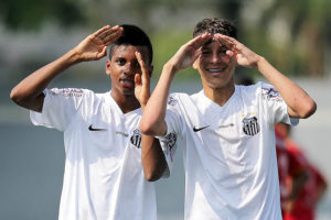 Rodrygo e Matheus Moraes comemoram gol pela equipe sub-15 do Santos (Crédito: Pedro Ernesto Guerra Azevedo/SantosFC)
