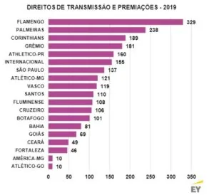 Em 2019, pela primeira vez em muito tempo, os contratos de direitos de TV foram divididos entre dois grupos, a Globo e a Turner. Entre os dez primeiros do ranking, Palmeiras e Internacional (o sexto, com R$ 155 milhões de receita) adotaram o mesmo modelo do Santos: acordo com Globo para TV aberta e PPV e com a Turner para a TV fechada.