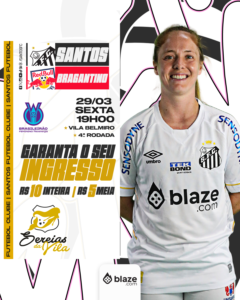 O Santos abriu a venda de ingressos para a partida das Sereias da Vila contra o Red Bull Bragantino nesta sexta-feira (29), às 19 horas, na Vila Belmiro, pela quarta rodada da primeira fase do Brasileirão Feminino A-1. O início das vendas acontece nesta terça-feira (26) e encerra às 19h15min no dia do jogo ou até esgotarem os tickets.