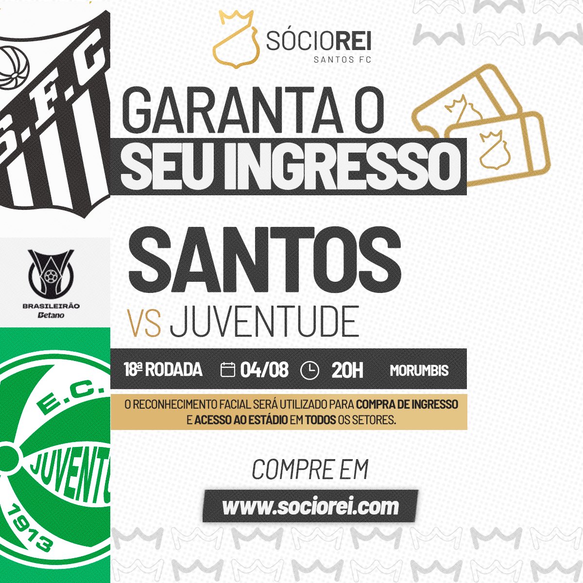 O Santos abriu a venda de ingressos para o jogo contra o Juventude na próxima segunda-feira (04), às 20 horas, no Morumbis, pela 18ª rodada do Brasileirão. A comercialização iniciou nesta segunda-feira (28), às 13 horas, com prioridade aos sócios com maior rating. Depois, abrirá para o público geral a partir das 17 horas.